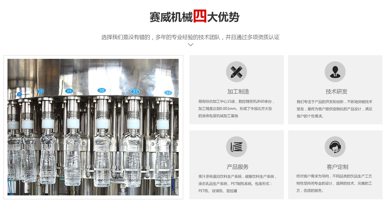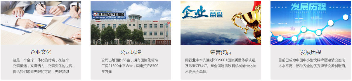 張家港市飲料機械有限公司(江蘇賽威)是一家專業從事飲料啤酒灌裝包裝自動化生產線設備及成套水處理設備設計制造的企業。是中國飲料啤酒裝備行業的核心骨干企業,是中國較早從事生產液體灌裝設備的廠家之一,是2008TOP中國食品工業十大民族制造商。目前已成為中國中小型飲料啤酒灌裝設備制造商。